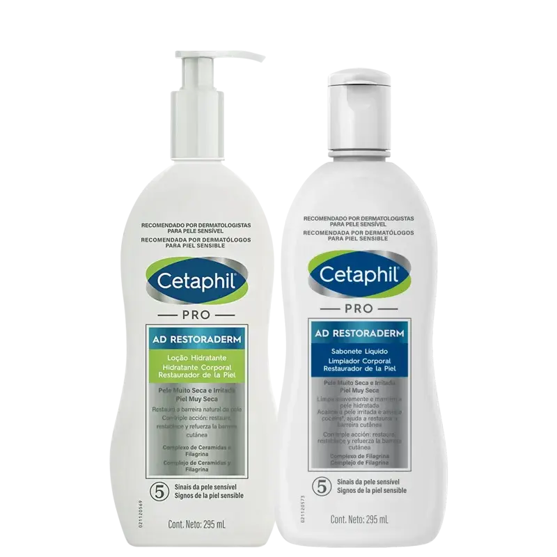 Kit com sabonete líquido e loção hidratante para pele muito seca, sensível ou atópica. Cetaphil Pro AD Restoraderm acalma e alivia a pele.
