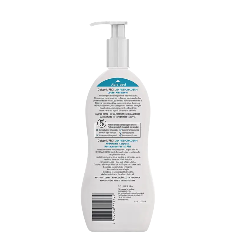 Loção hidratante hipoalergênica e corporal para pele muito seca, sensível ou atópica. Além de hidratar, Cetaphil Pro AD Restoraderm acalma e alivia o prurido da pele atópica resturando a barreira cutânea. Também ajuda a restabelecer o equilíbrio da pele e reforça seu sistema de defesa.