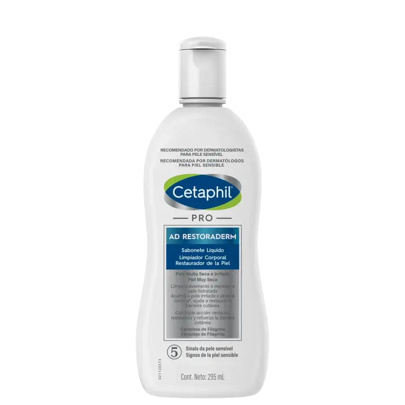 Sabonete líquido para pele muito seca, sensível ou atópica. Cetaphil Pro AD Control acalma e alivia o ressecamento e prurido da pele atópica.