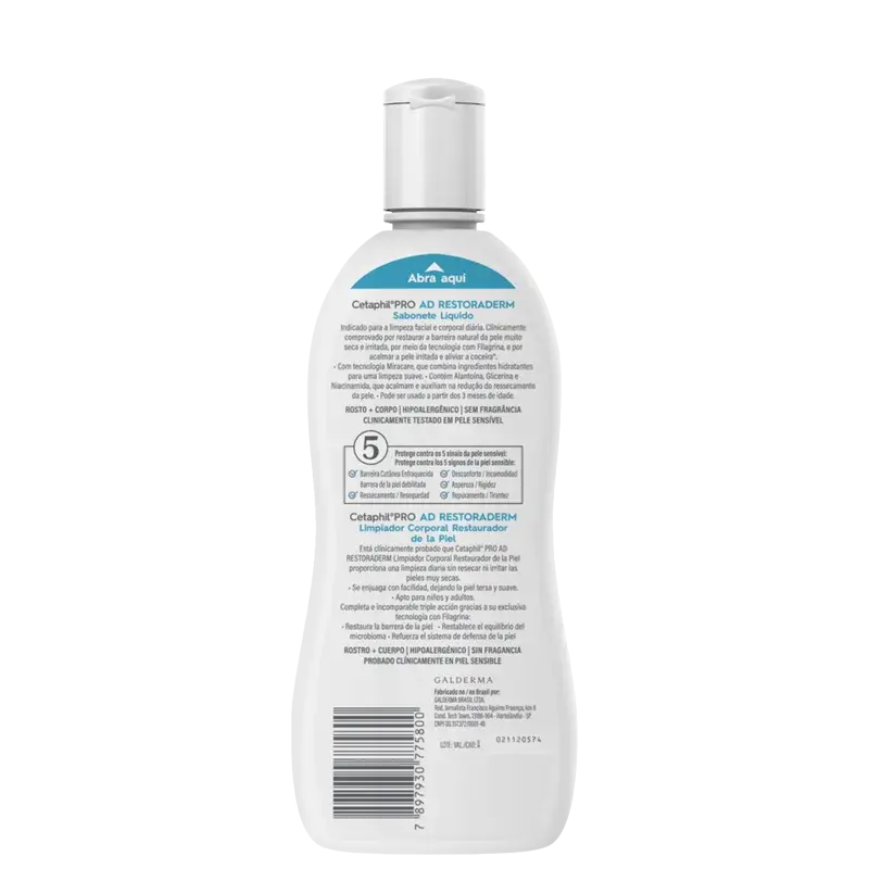 O Sabonete Líquido Cetaphil Pro AD Control limpa suavemente e mantém a pele hidratada. Promove restauração da barreira cutânea desde o banho e sensação de alívio para a pele com irritação ou coceira, através da Tecnologia F-Repair.